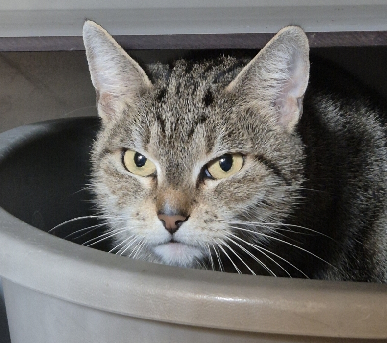 ze komt uit een winkel waar ze ook een ommetje kon maken maar waar ze niet meer mocht blijven. Ze is eigenzinnig, kan wel eens een tik uitdelen maar kan ook lief zijn, is niet bang, was enig kat en dat bevalt haar wel.