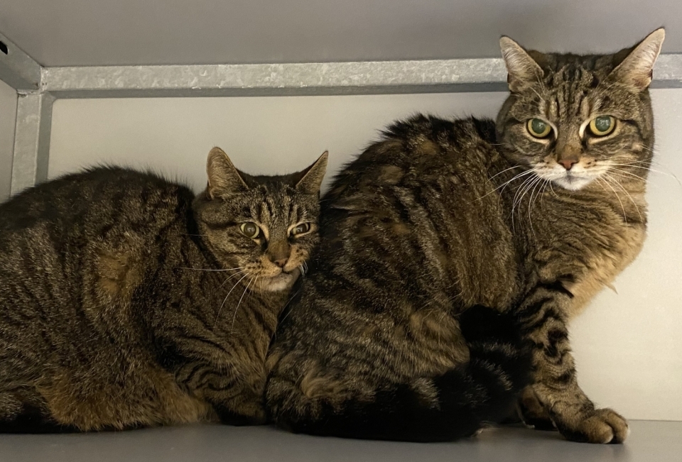 vanwege overlijden van hun huisgenote. Ze zijn een rustig thuis gewend bij een oudere dame en vreemden vinden ze eng. Beiden zijn nu ook angstig, Tieme meer dan Floor maar ze doen niet lelijk. Ze proberen zich alleen te verstoppen.